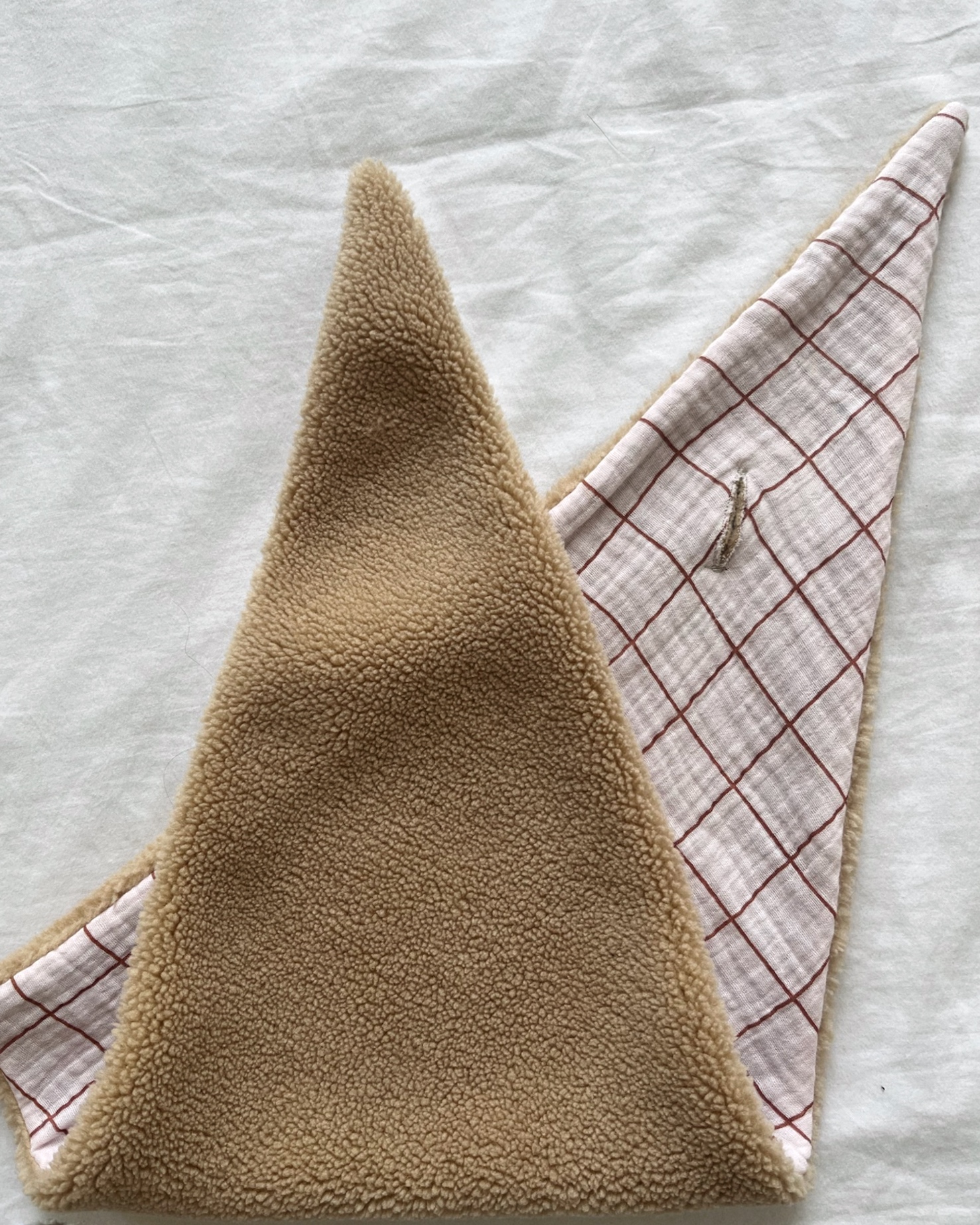 Il est réversible : une face en tissu sherpa style laine de mouton ; l’autre en double-gaze de coton.